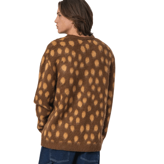 100% acrylic, regular fit, fuzzy knitted crew with all over intarsia knit and woven label branding at hem